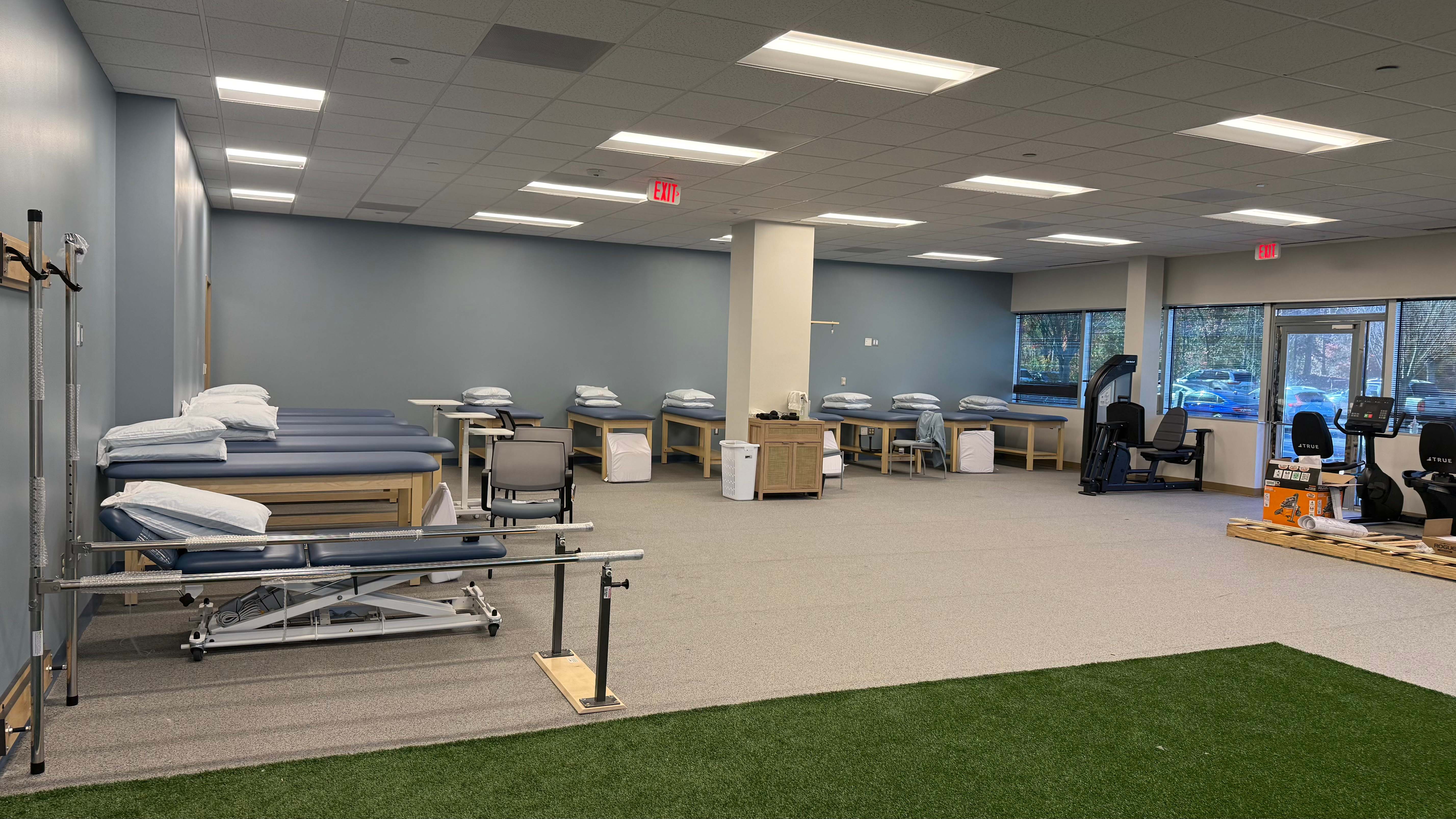 The Reston location also includes a dedicated therapy zone with turf, enhancing functional training and expanding treatment capabilities for patients. Furniture throughout the space was carefully selected and procured by Lines Furniture, reinforcing both comfort and functionality. The result is a modern, supportive physical therapy environment that reflects Advantage Physical Therapy’s commitment to care, recovery, and patient experience.
