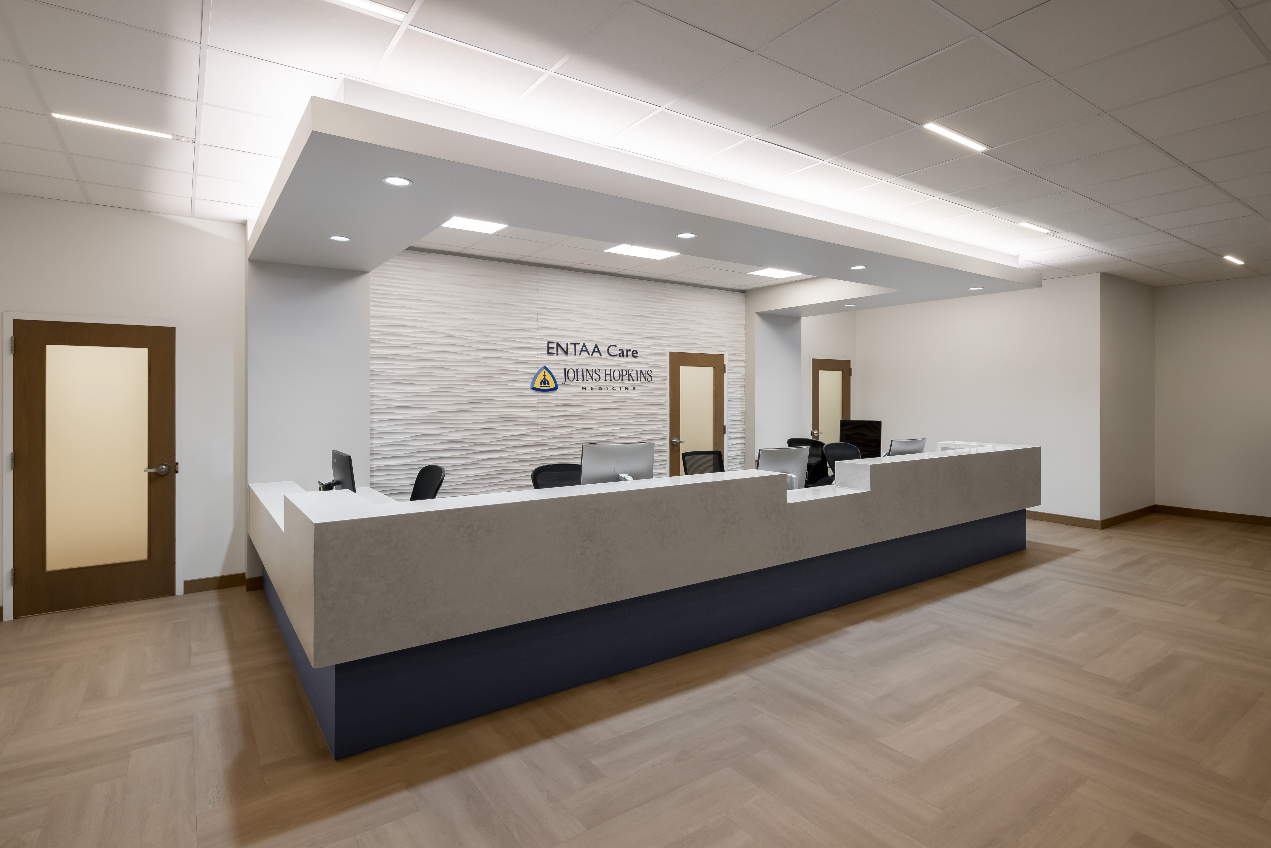 Interplan recently completed a 12,000 square foot multi-specialty medical office facility in Columbia, Maryland for ENTAA Care, a branch of Johns Hopkins Medicine — a practice delivering personalized care across a comprehensive range of specialty services. The project involved the full build-out of a shell space, transforming an unfinished interior into a cohesive, fully operational clinical environment. The facility consolidates ENTAA Care's full spectrum of clinical offerings into a single clinic, housing dedicated departments for Ear, Nose & Throat, Allergy & Asthma, Audiology, Dermatology, and Speech Pathology, as well as multiple administrative areas that support operational staff.